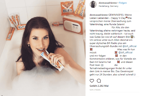 Im Gegensatz zu den ganzen anderen Posts wird hier immerhin offensichtlich etwas beworben. Bifi setzt mit den Influenzern nicht auf Salamitaktik, hier geht’s gleich um die Wurst. War aber wohl doch nicht so gelungen wie gedacht, denn der Account ist inzwischen auf Privat gestellt.