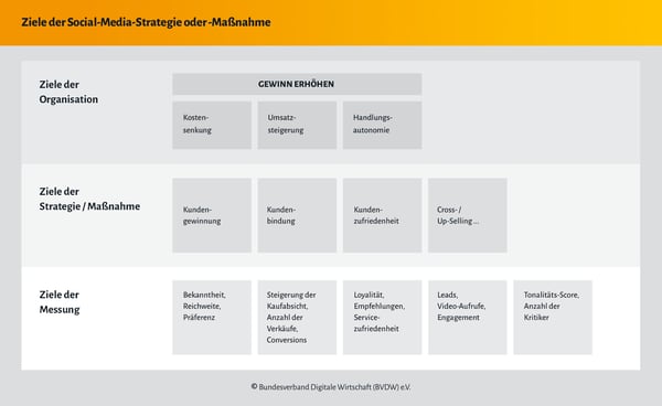 In erster Linie dreht sich alles um die Ziele des eigenen Unternehmens. Nur wenn diese definiert sind, kann eine Marketingstrategie implementiert werden und mit dieser die Ziele für Social Media. Der Bundesverband Digitale Wirtschaft (BVMW) fasst dies wie folgt zusammen: