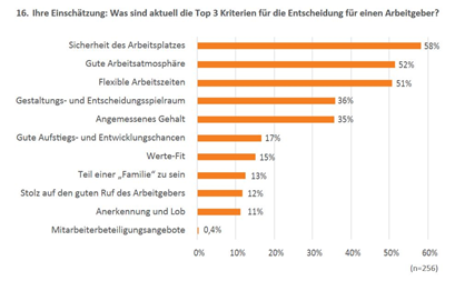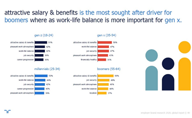 Laut dem Randstad Employer Brand Research 2020 Global Report – die Befragung erfolgte noch vor der Pandemie – sind ein attraktives Gehalt & Benefits immer noch das Jobkriterium Nummer 1. Allerdings dicht gefolgt von der Work-Life-Balance, die in allen Generationen einen Wert zwischen 42 % und 47 % erreicht. Den Generationen Y und Z ist es sehr wichtig, dass der neue Job einen Karrierefortschritt darstellt.