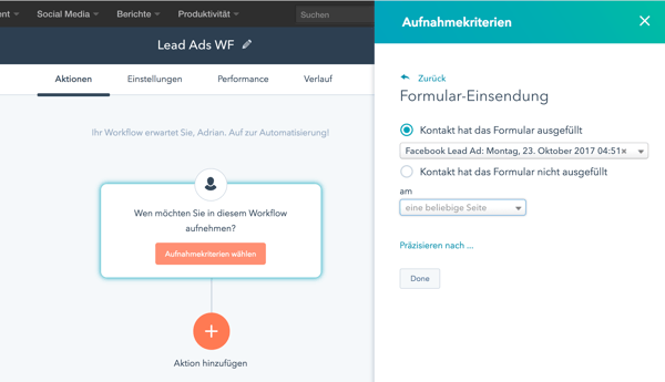 Nachdem die Facebook Lead Ads Kampagne live ist, wirst du bemerken, dass der über HubSpot erstellte Lead Ad namentlich unter “Formular-Einsendungen” bei der Kriterienauswahl für Workflows und Listen wiederzufinden ist.