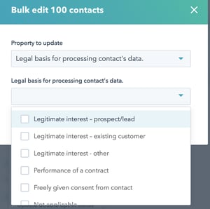 Für die rechtliche Grundlage der Verarbeitung von Kontaktdaten stellt HubSpot eine eigene Eigenschaft mit verschiedenen Auswahlkriterien zur Verfügung. Diese kann man im Kontaktdatenblatt selbst, bei einem Import, als Massenverarbeitung, durch Workflows, durch Formulare oder durch APIs bei jedem Kontakt festlegen.