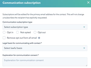 Anhand der Abonnementtypen, die man individuell festlegen kann (zum Beispiel für Marketing, Sales und Services), kann man sehen, welche rechtliche Grundlage der Kontakt für die Kommunikation erteilt hat: hat sich angemeldet, nicht angemeldet oder abgemeldet (Voreinstellung) und hat sich abgemeldet.