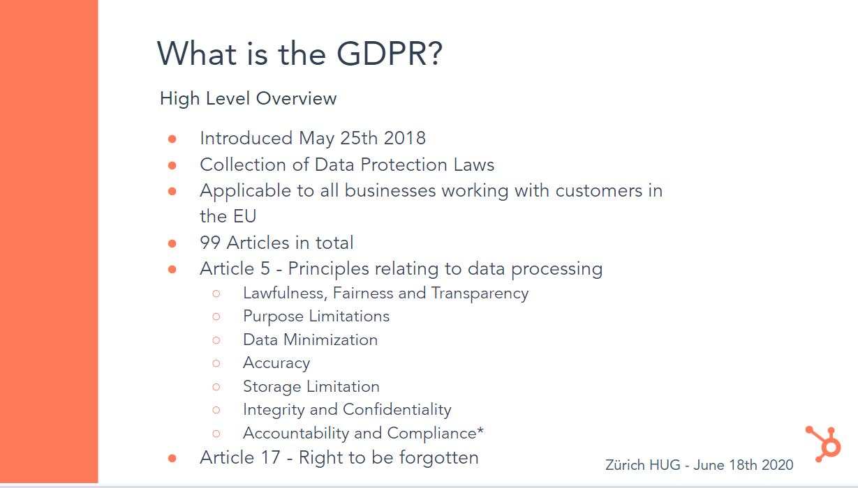 Das Thema der Veranstaltung war eigentlich schon für den Februar dieses Jahres angedacht, musste aber aus HubSpot internen Gründen verschoben werden. Doch wie heisst es so schön: Aufgeschoben ist nicht aufgehoben! Daher holten wir das Thema E-Privacy und DSGVO (engl.: GDPR) diesmal nach. Wir konnten wieder einen HubSpot-Mitarbeiter für den Vortrag gewinnen: Quentin Lauth, Principal Inbound Consultant in Dublin und English Speaker, um der Vielsprachigkeit in der Schweiz wenigstens einmal im Jahr zu genügen.