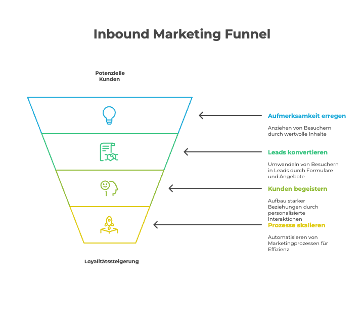 Grundlegend kann man sich den Inbound Marketing Kanal wie ein Trichter vorstellen. Im folgenden Schau bild haben wir die wichtigsten Schritte dargestellt.