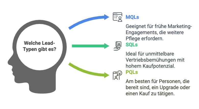 Marketing Qualified Leads (MQLs): Diese sind potenzielle Kunden, die durch gezielte Marketingmaßnahmen wie Online-Kampagnen, Webinare oder Content-Marketing auf ein Unternehmen aufmerksam geworden sind. Sie haben möglicherweise ein Formular ausgefüllt, um ein Whitepaper herunterzuladen, oder sich für einen Newsletter registriert. Obwohl sie Interesse zeigen, sind sie noch nicht bereit, einen Kauf zu tätigen. MQLs benötigen weitere Betreuung und gezielte Ansprache, um im Verkaufsprozess voranzukommen.