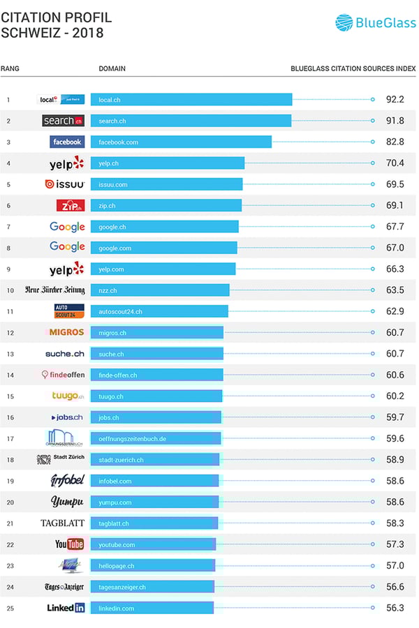 Die Agentur “Blue Glass” führt jedes Jahr ein Ranking der wichtigsten Schweizer Verzeichnisse im Bezug auf Local-SEO durch. Dies ist eine praktische Hilfe bei der Frage, welche Plattformen zwingend mit den Unternehmensangaben versorgt werden sollten. In der nachfolgenden Grafik siehst du das aktuellste Ranking aus dem Jahr 2018.