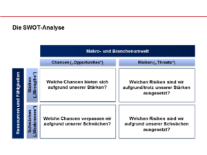 Wenn diese Punkte geklärt sind, lässt sich dein Unternehmen bzw. deine Marke in das bestehende Markt- und Angebotsgefüge einordnen. Es wird klar, wie du im Vergleich zum Wettbewerb positioniert bist. Dann ist zu entscheiden: Wie will dein Unternehmen bzw. deine Marke sich in Zukunft im Gefüge der sich veränderten Märkte aufstellen? Im Rahmen dieser Fragestellung wird auch eine SWOT-Analyse durchgeführt. Sie macht die Positionsbestimmung und Firmenstrategie sowie die Stärken und Schwächen deutlich und zeigt die Chancen und Risiken deiner Marke auf.
