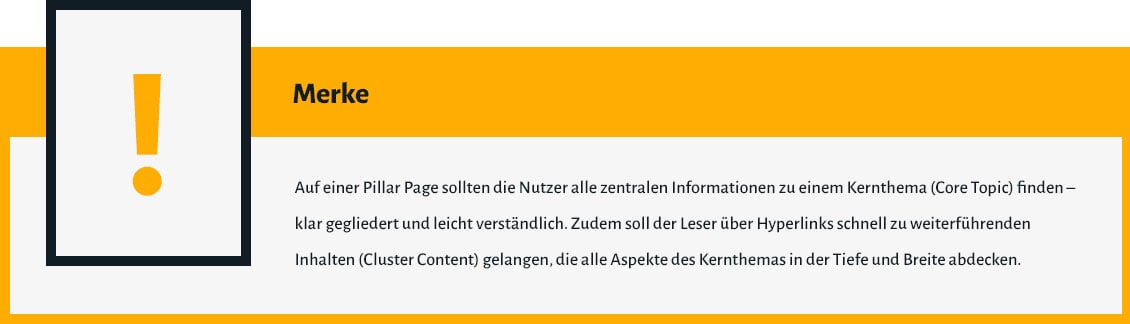 Auf einer Pillar Page sollten die Nutzer alle zentralen Informationen zu einem Kernthema (Core Topic) finden – klar gegliedert und leicht verständlich. Zudem soll der Leser über Hyperlinks schnell zu weiterführenden Inhalten (Cluster Content) gelangen, die alle Aspekte des Kernthemas in der Tiefe und Breite abdecken.