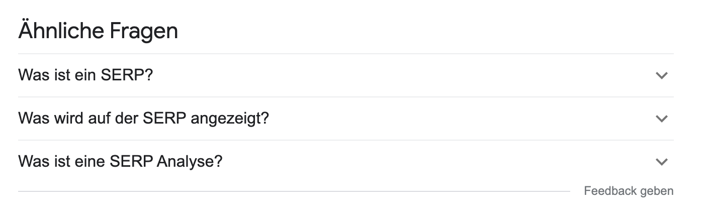 Ausserdem können Texte und Formate so verändert werden, dass die Wahrscheinlichkeit steigt, bei Elementen angezeigt zu werden, die sich um dieselben Fragestellungen drehen, wie das People Also Asked Feature oder das Featured Snippet.