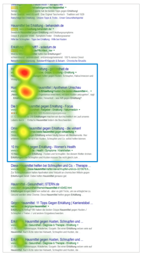 Die organischen Treffer, vor allem die oberen, erhielten deutlich mehr Aufmerksamkeit und Klicks als die Anzeigen. Sie werden durchschnittlich 4.43 Sekunden betrachtet und bekommen ca. 70 Prozent der ersten Klicks ab. Bei den organischen Suchresultaten wird der URL deutlich mehr Aufmerksamkeit geschenkt als dem Titel des Snippets. Grund hierfür ist, dass es den Titeln meist an einem Alleinstellungsmerkmal fehlt. Als weiteres wichtiges Auswahlkriterium zeigt sich hier die Marke. Dabei sind vor allem ihre Seriosität, Bekanntheit und Image ausschlaggebend.