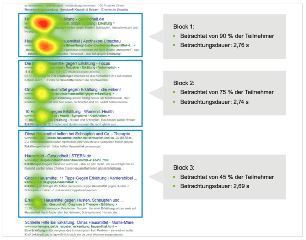 Betrachtet man den Blickverlauf innerhalb der organischen Suchresultate, ist folgendes Muster erkennbar: Die Aufmerksamkeit gliedert sich von oben nach unten in Blöcke. Diese Blöcke enthalten mehrere Suchtreffer, die ähnlich stark fixiert werden. Der erste Block umfasst die Treffer 1 und 2, der zweite Block die Treffer 3, 4 und 5 und der dritte Block die Treffer 6, 7, 8 und 9. Die Intensität der Aufmerksamkeit nimmt von oben nach unten ab. So wurde der erste Block von 90% angeschaut und 2.76 Sekunden betrachtet. Der zweite Block schaffte es auf 75% und 2.74 Sekunden. Der dritte schliesslich auf 45% und 2.69 Sekunden.