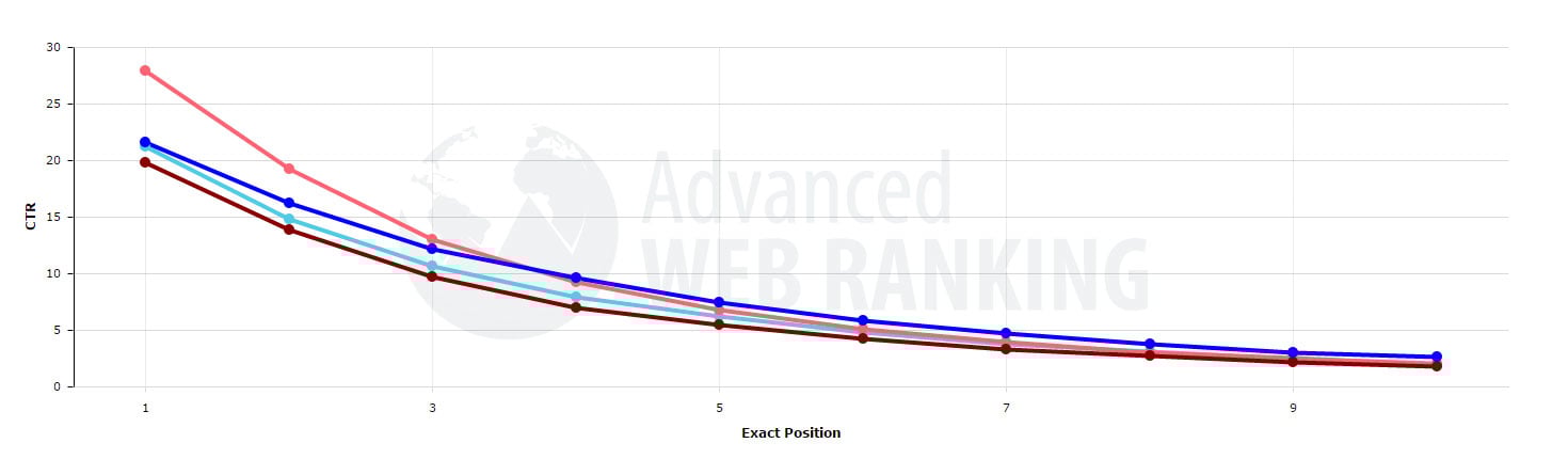 CTR nach Position bei organischen Suchresultaten: pink: ohne Ads - hellblau: mit Ads - braun: nur mit Top-Ads - blau: nur mit Bottom-Ads (Quelle: AWR-Studie)