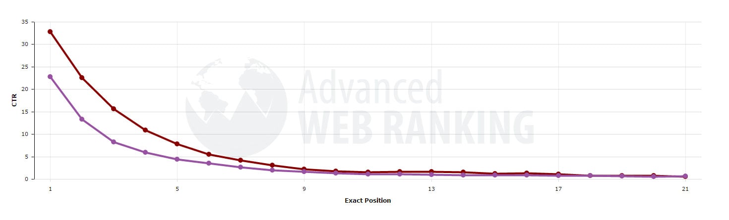 CTR nach Position bei organischen Suchresultaten: violett: transaktionsorientiertes Suchmotiv - rot: informationsorientiertes Suchmotiv (Quelle: AWR-Studie)