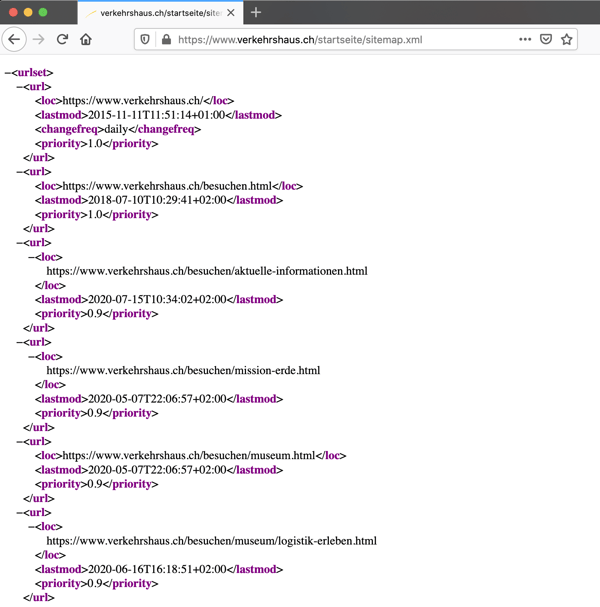Screenshot der XML-Sitemap der Website des Verkehrshauses Luzern