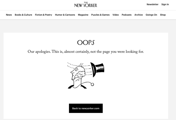 The New Yorker uses a version of its iconic logo graphic to indicate that something is amiss and politely redirects the visitor back toward the main site.