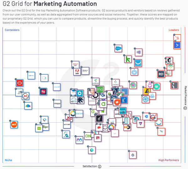 The best marketing automation software products are determined by customer satisfaction (based on user ratings) and scaling (based on market share, vendor size and social impact). They are ranked in four categories on the grid: