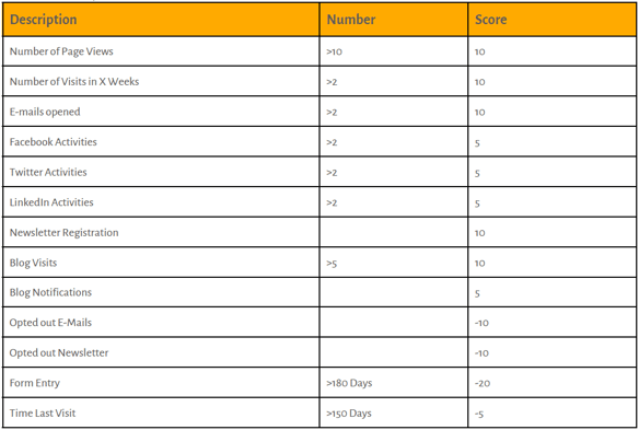 When setting up lead scoring, think about the actions a user can take on your site that are important to your business. It can be helpful to write down some of these actions and assign a score to them. This makes it easier for you to set a minimum score to qualify your leads.