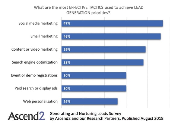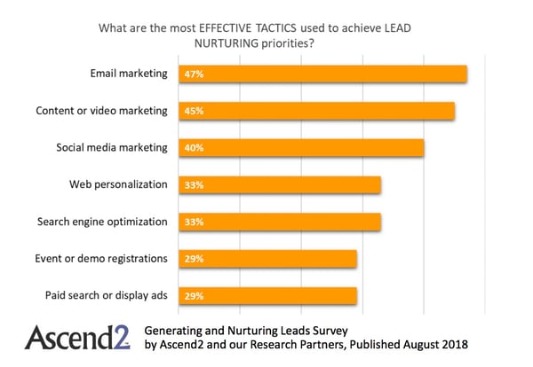 E-Mail-Marketing und Content-Marketing oder Video-Marketing sind die effektivsten Taktiken beim Lead-Nurturing gemäss 47% bzw. 45% der Marketing-Influencer.