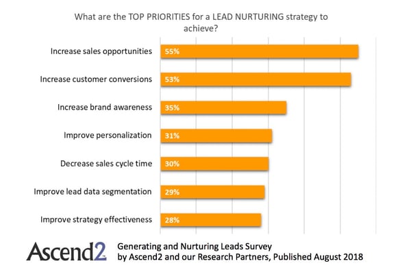 Marketing-Influencer geben mehr Verkaufschancen (55%) und mehr Kundenkonversionen (53%) als oberste Ziele der Lead-Nurturing-Strategie an.